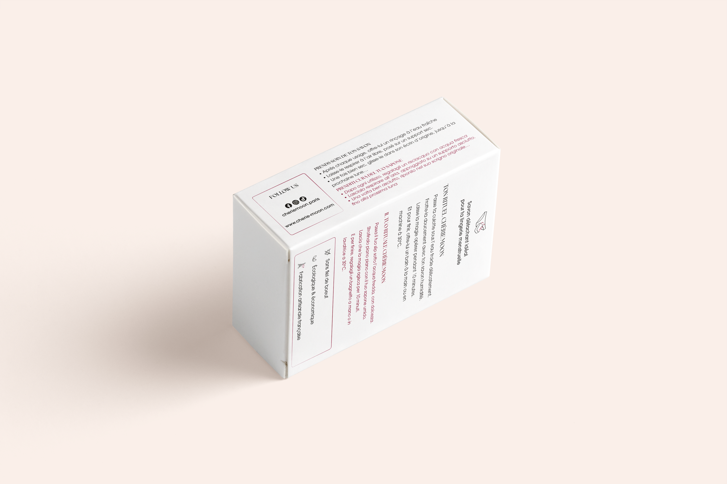 Création de l’identité visuelle complète de la marque de lingerie menstruelle “Chérie Moon”, où j’ai créé le logo, la charte graphique, les supports prints ainsi que les packagings.