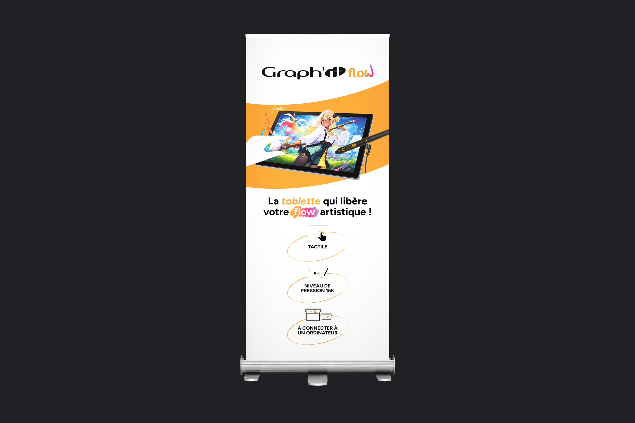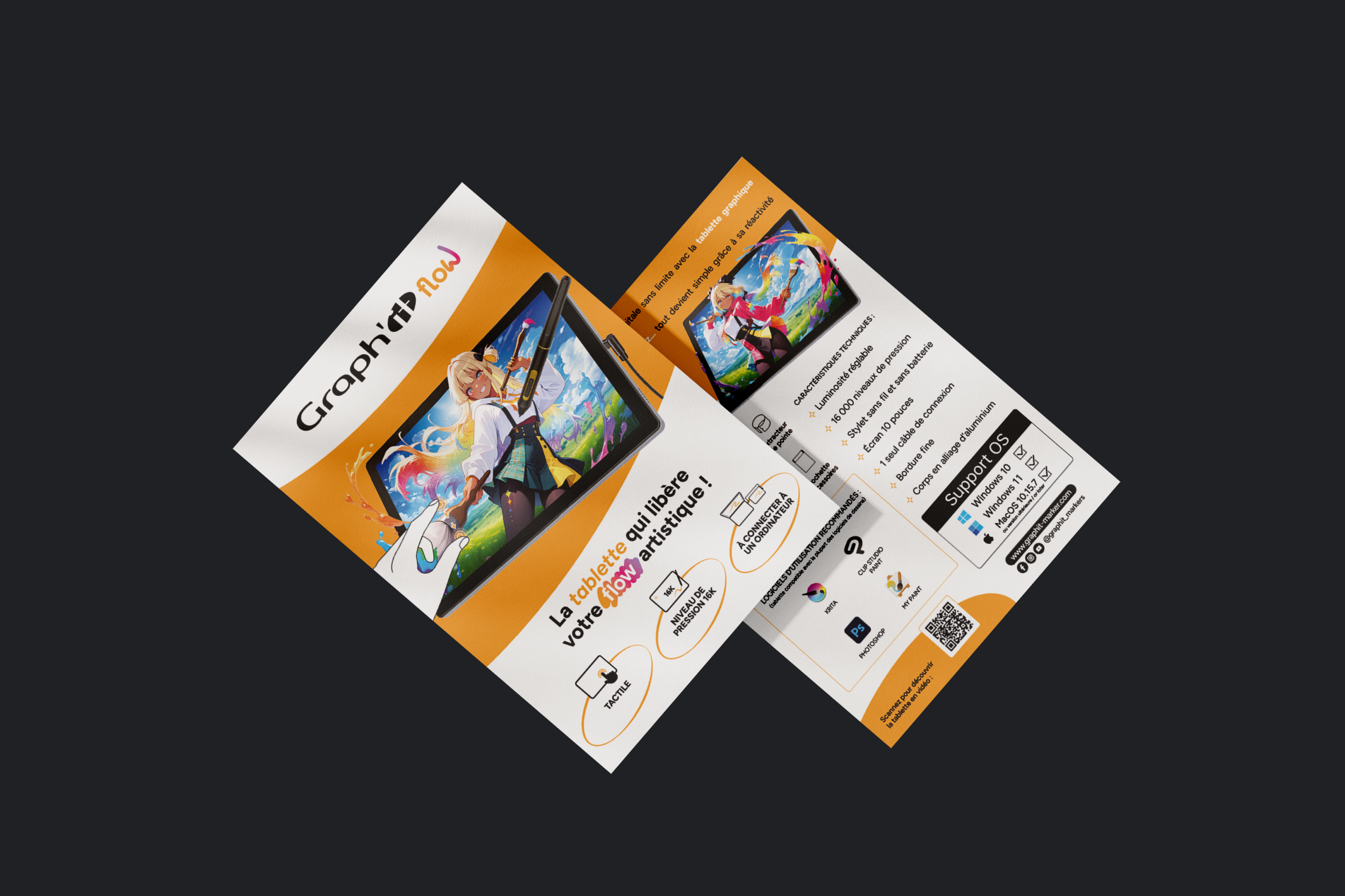 Graph’it Flow est une gamme de produits conçue autour de la tablette graphique, nécessitant une identité cohérente et impactante. En tant que graphiste freelance, j’ai travaillé sur la déclinaison du logo ainsi que sur la création des packagings et des supports de communication.