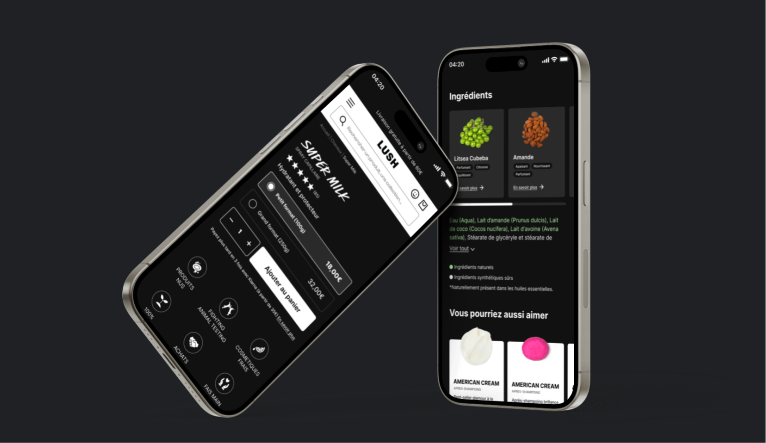 Découvrez la refonte du site de Lush, où j'ai amélioré l'expérience utilisateur en revisitant la homepage, la page liste et la fiche produit. J'ai opté pour un design épuré avec un fond noir écologique, rappelant l'esthétique des magasins Lush et leurs packagings iconiques. Cette approche assure une interface rassurante pour les nouveaux clients tout en conservant une familiarité pour les habitués.
